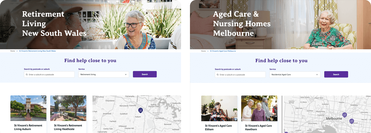 A unique location finder service was developed for the St Vincent’s Care site. This functionality makes it easy for users to find the home care, residential aged care, retirement living, respite care and dementia care facilities that are right for them.